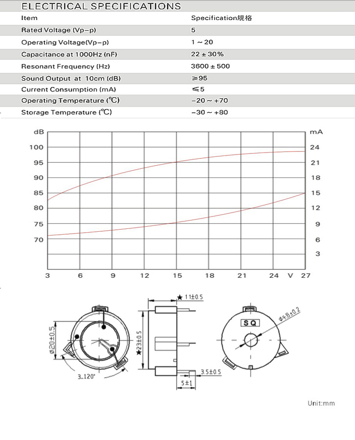 基本參數(shù) 產(chǎn)品料號(hào):MIMS23113600 產(chǎn)品尺寸(mm):23*11 額定電壓(V):5 諧振頻率(Hz):3600 聲壓值(dB):≥95 產(chǎn)品用途:廣泛應(yīng)用于APP智能家居控制器、智能機(jī)器人、無(wú)人機(jī)、AI穿戴設(shè)備、安防系統(tǒng)、醫(yī)療設(shè)備、車載系統(tǒng)、支付系統(tǒng)、通信設(shè)備,各種PDA等產(chǎn)品領(lǐng)域